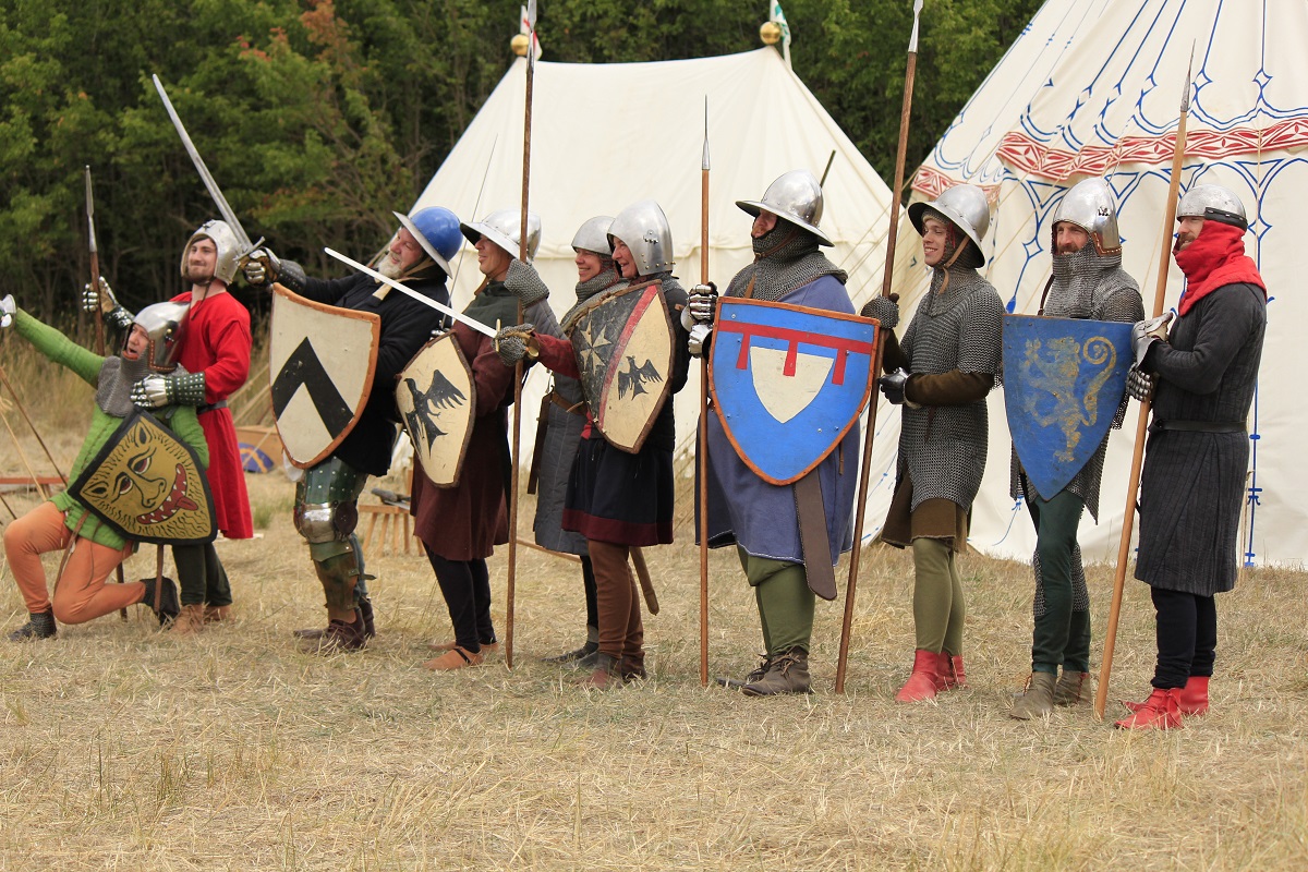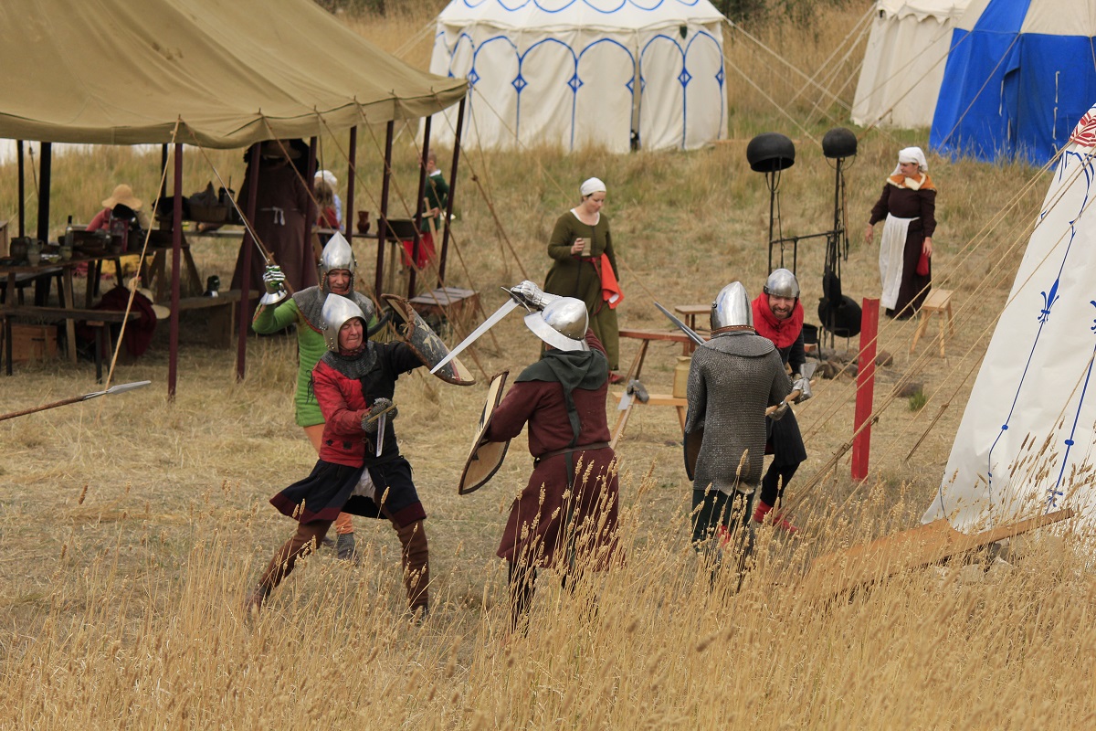 I did manage to partially refurbish a dodgy bascinet before the event, so I could use it with a borrowed arming cap, and someone lent me a heather shield for the group foot combat. My old gambeson, a standard, borrowed maille mittens and off I went. It was my first time being involved in this and it was really quite good fun. I was killed so many times…