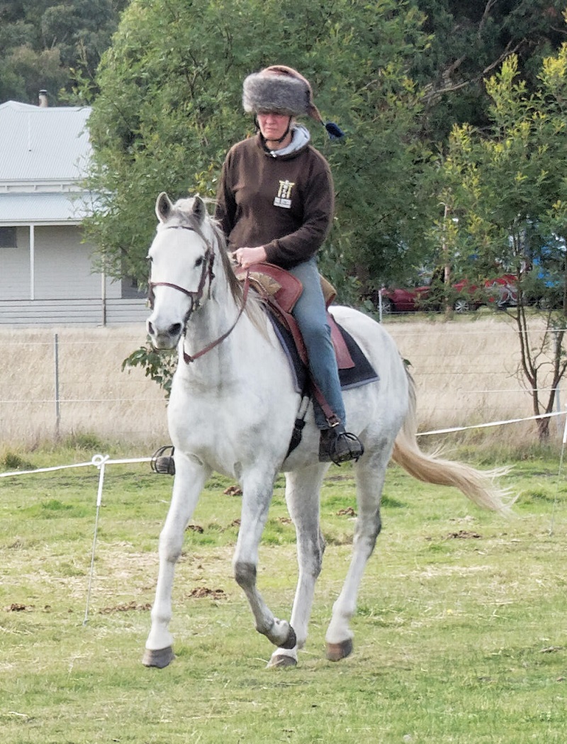 He has done quite a few trail rides, including some in steep and rough country. He has learned about armour and weapons and we have been practicing passes. He is already super at quintain runs. In addition, he enjoys fun group sessions where we play not just with weapons, but with giant inflateable dinosaurs and unicorns. He has also picked up the basics of Spanish walk. I am looking forward to joust training in the near future, but I am progressing his dressage work, where we are already up to shoulder in and working towards travers.